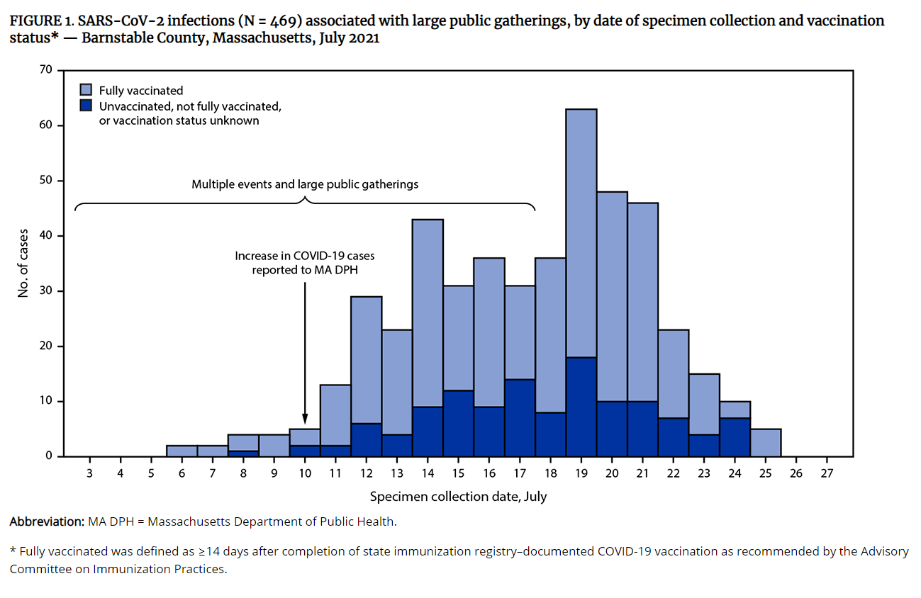 CDC의 자료 또한 백신 접종 완료자들 사이에서 감염율이 높음을 보여준다(469명의 확진자 중 74%가 백신접종완료자).