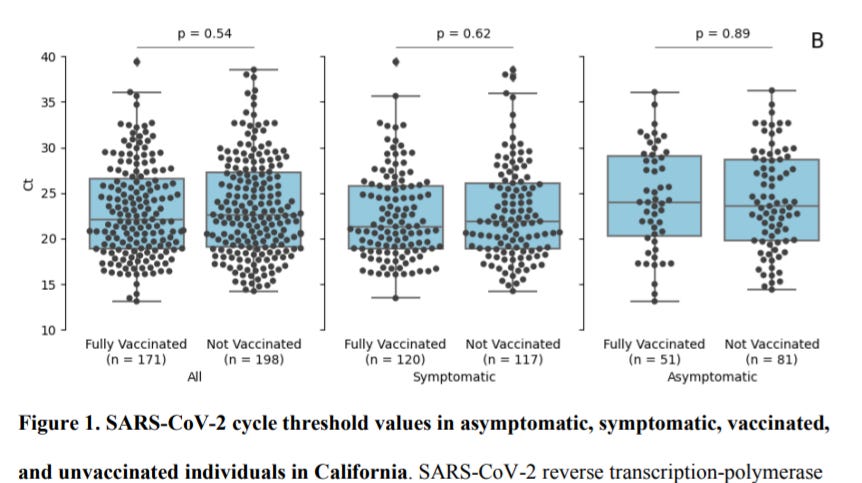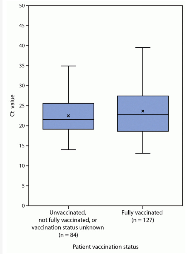 Preprint from a great scientist, Joe DeRisi. He did a rotation in my lab at Stanford decades ago. medrxiv.org/content/10.110… "No Significant Difference in Viral Load Between Vaccinated and Unvaccinated, Asymptomatic and Symptomatic Groups Infected with SARS-CoV-2 Delta Variant"CDC 자료 또한 백신 접종자와 비접종자 사이에 PCR cycle threshold의 차이가 없음을 밝혔다.