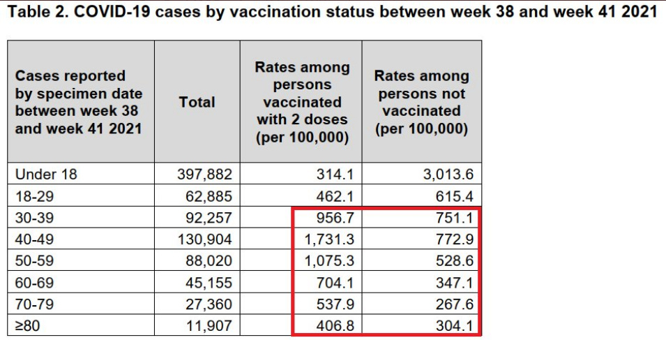 충격적인 최신 영국 정부보고서에 따르면 코로나 백신 접종완료군이 비접종군보다 코로나에 감염된 숫자가 (10만명당) 높으며 특히 30세 이상 집단에 그 현상이 도드라졌다 (아래 표 참조).
